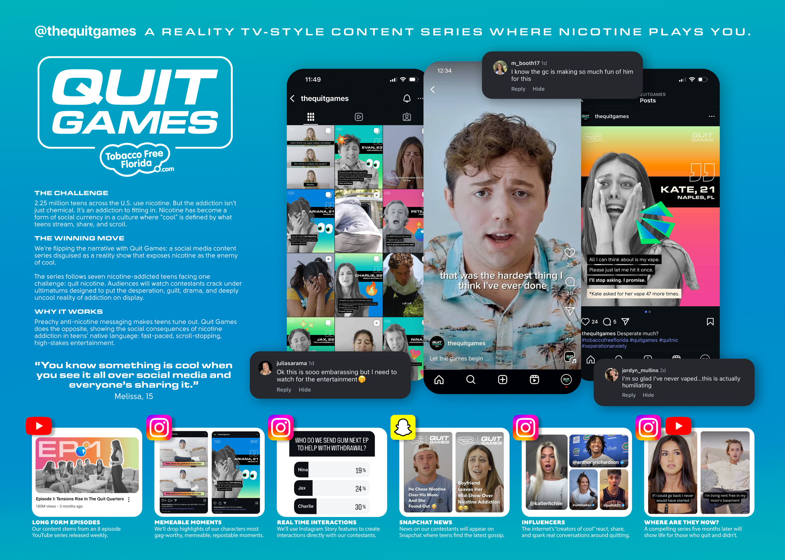 Infiltrate teen culture with Quit Games, a dramatic social media content series disguised as a reality competition show that exposes how unbearably embarrassing nicotine addiction can be.